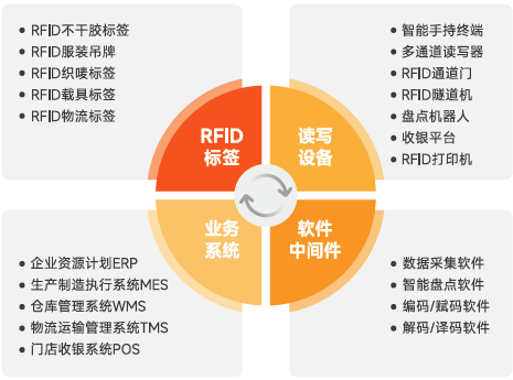方案中包含了RFID電子標(biāo)簽、讀寫設(shè)備、手持終端、打印機、數(shù)據(jù)采集軟件、智能盤點軟件、業(yè)務(wù)系統(tǒng)等產(chǎn)品。