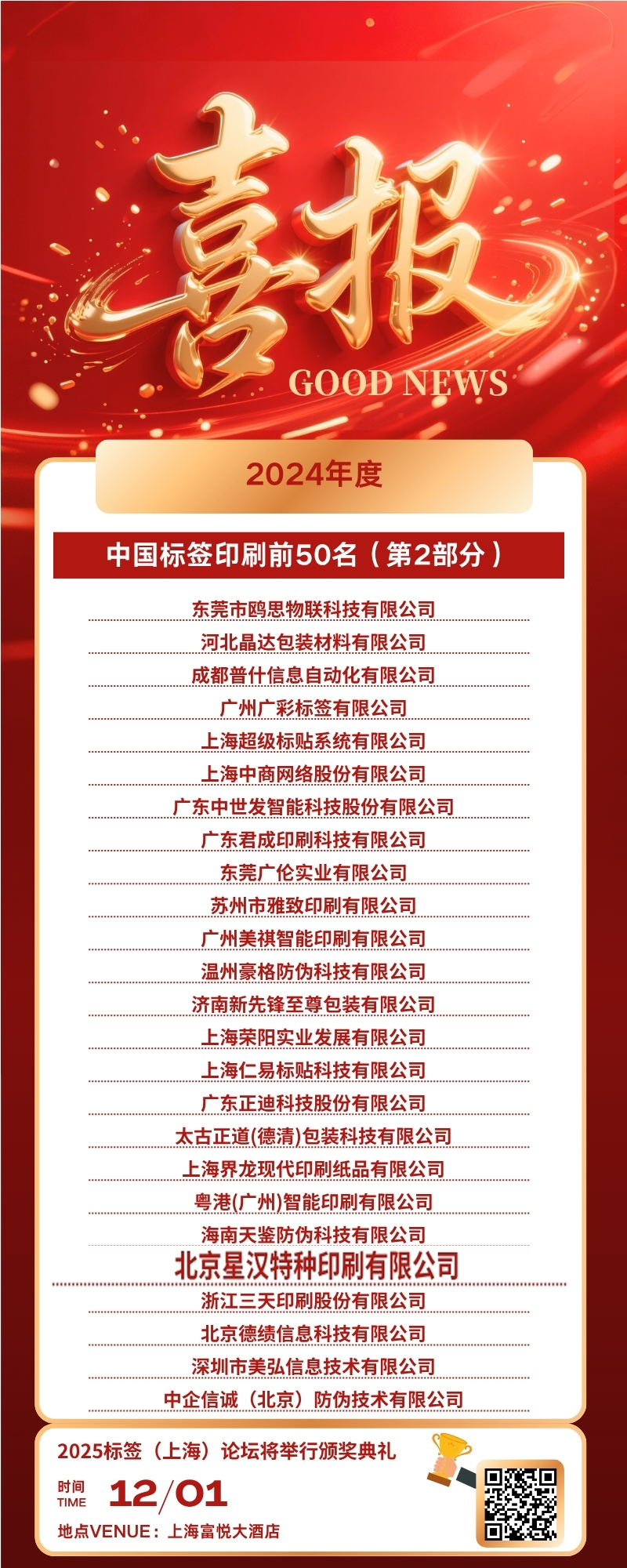 近日,中國包裝聯(lián)合會正式發(fā)布2024年度中國包裝行業(yè)信息統(tǒng)計結(jié)果,北京星漢特種印刷有限公司憑借在標簽技術領域的突破性創(chuàng)新、全行業(yè)場景的深度賦能及品牌影響力,獲得“2024年度中國標簽印刷前50名企業(yè)”榮譽。作為深耕防偽溯源行業(yè)26年的企業(yè),星漢特種印刷始終以技術革新重構標簽價值,將物理標識與數(shù)字科技深度融合,為各行業(yè)提供從防偽到數(shù)字化運營的全鏈路解決方案。
