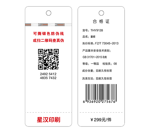 雙線安全線防偽是當(dāng)前最新防偽技術(shù)之一,其安全級(jí)別等同與人民幣防偽安全線級(jí)別。最大的特點(diǎn)就是安全級(jí)別高,防偽效果好,還有就是易于鑒別。其實(shí)這一點(diǎn)很重要,因?yàn)榉纻沃饕亲鼋o消費(fèi)者看的,是企業(yè)提供給消費(fèi)者區(qū)分真假的認(rèn)知工具,目的是讓消費(fèi)者不受假冒偽劣產(chǎn)品的蒙蔽。要提高消費(fèi)者鑒別積極性,提高鑒別率,使主動(dòng)識(shí)別、拒絕、打擊假冒成為可能,那防偽特征就必須能夠讓任何層次的消費(fèi)者、管理者無需借助任何儀器、工具或支付額外費(fèi)用都能親自簡(jiǎn)單、準(zhǔn)確地識(shí)別、而且結(jié)論準(zhǔn)確可靠。因此,安全線防偽技術(shù)是當(dāng)前最好的防偽措施之一。北京星漢特種印刷有限公司將這項(xiàng)技術(shù)運(yùn)用到了收拾吊牌、衣服吊牌中,也受到了客戶的青睞。